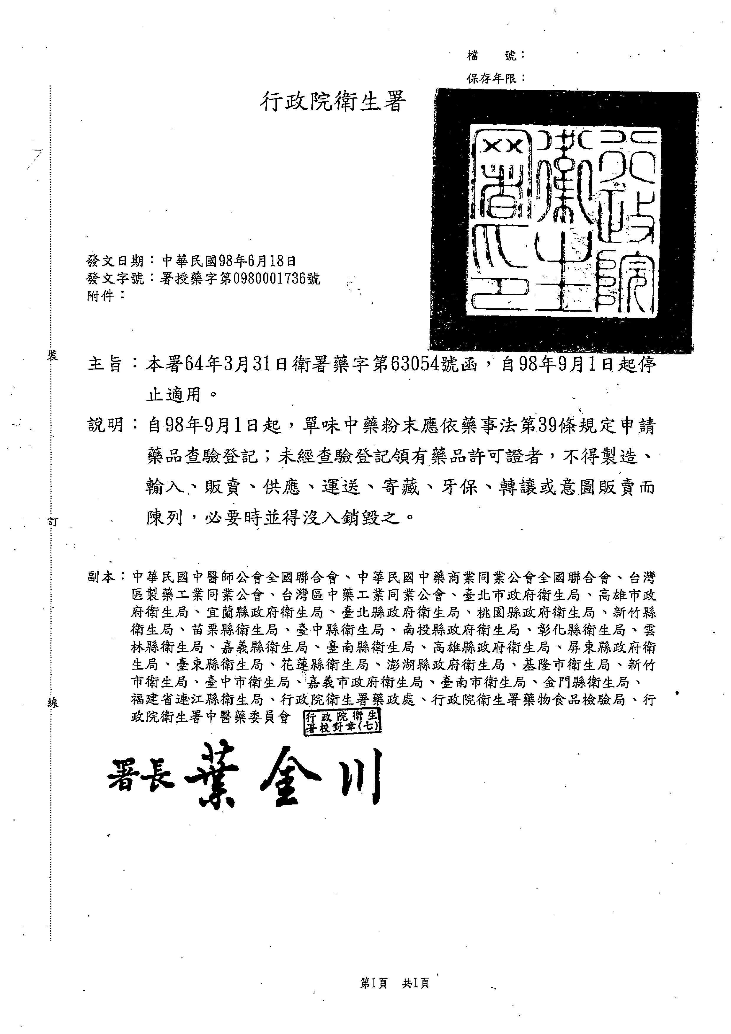 發文日期:中華民國98年6月18日 發文字號:署授藥字第0980001736號 主旨:公告本署64年3月31日衛署藥字第63054號函,自98年9月1日起停止適用。 說明:自98年9月1日起,單味中藥粉末應依藥事法第39條規定申請藥品查驗登記;未經查驗登記領有藥品許可證者,不得製造、輸入、販賣、供應、運送、寄藏、牙保、轉讓或意圖販賣而陳列,必要時並得沒入銷毀之。