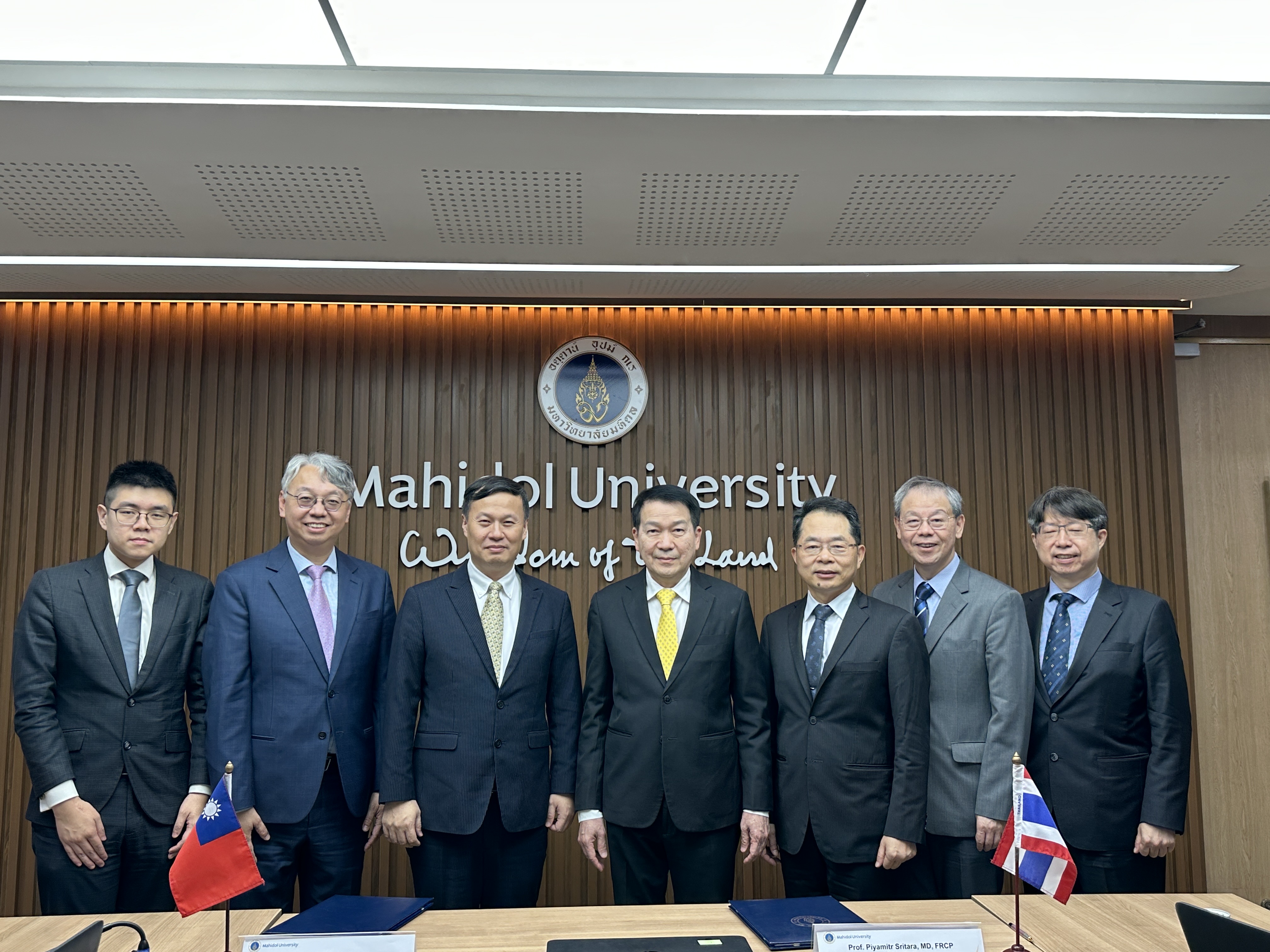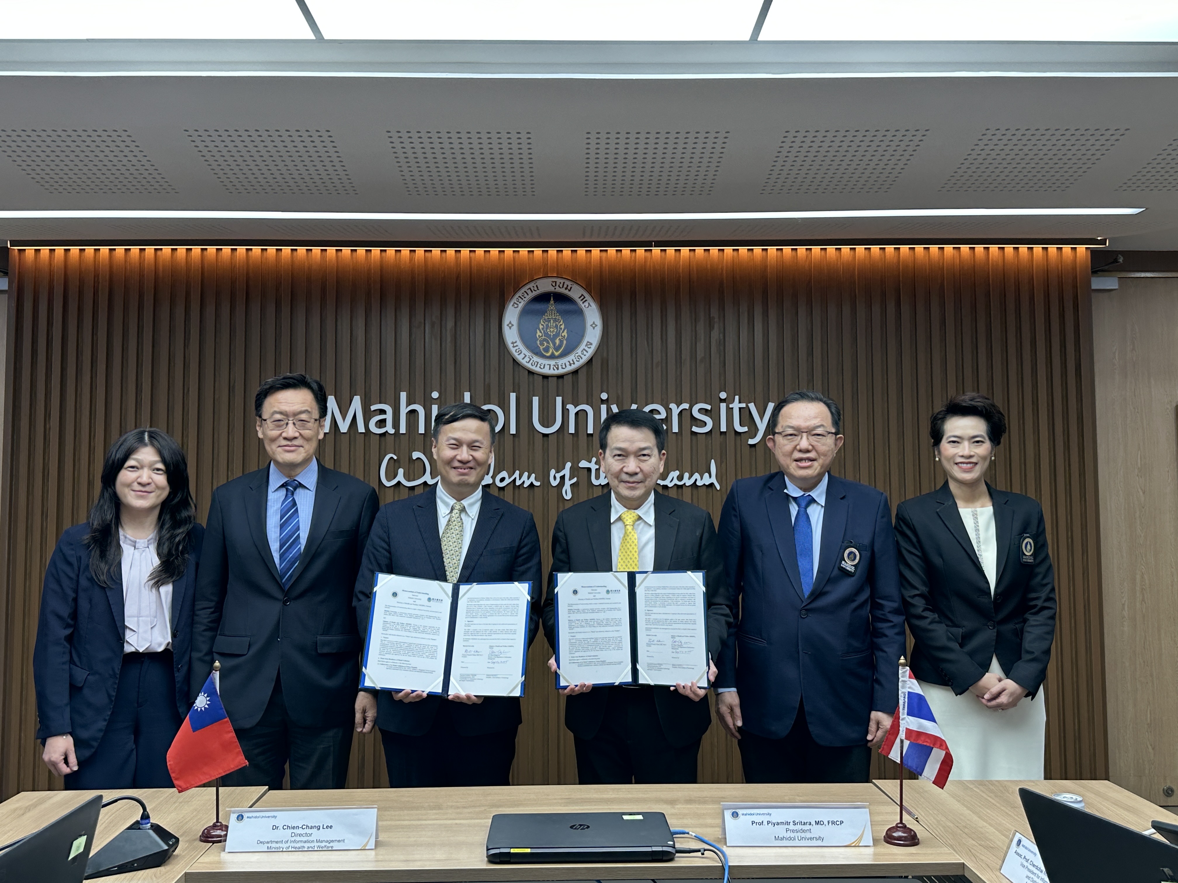 簽約儀式由衛生福利部資訊處李建璋處長與瑪希敦大學(Mahidol University)Piyamitr Sritara校長共同簽署,泰方見證人包括瑪希敦大學Cherdchai Nopmaneejumruslers副校長及Nopraenue Sajjarax Dhirathiti副校長,臺方則由亞洲理工學院李百祺校長與工研院產科國際所張慈映副所長擔任見證。此外,臺中榮總吳杰亮副院長、高雄長庚林祖功副院長、亞東醫院洪芳明副院長及國防醫學院林嶔副教授等四家「臨床AI取證驗證中心」的關鍵推動者亦出席見證,顯示雙方對深化國際醫療合作的堅定承諾。
