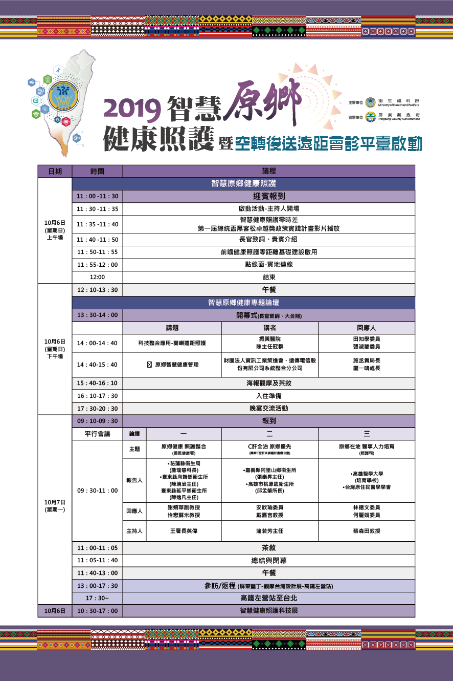 衛福部於108年6日、7日於屏東縣辦理2019原鄉健康照護研討會,以「智慧原鄉健康照護」為主題,應用科技強化原鄉醫療照護資源,以前瞻數位基礎建設、空轉後送遠距會診平臺及遠距照護等計畫提升在地醫療效能,透過中央、地方、民間跨域協力夥伴合作,促進原鄉健康照護整合推動,發展創新健康照護模式,讓原鄉健康照護更智慧更無距離。
