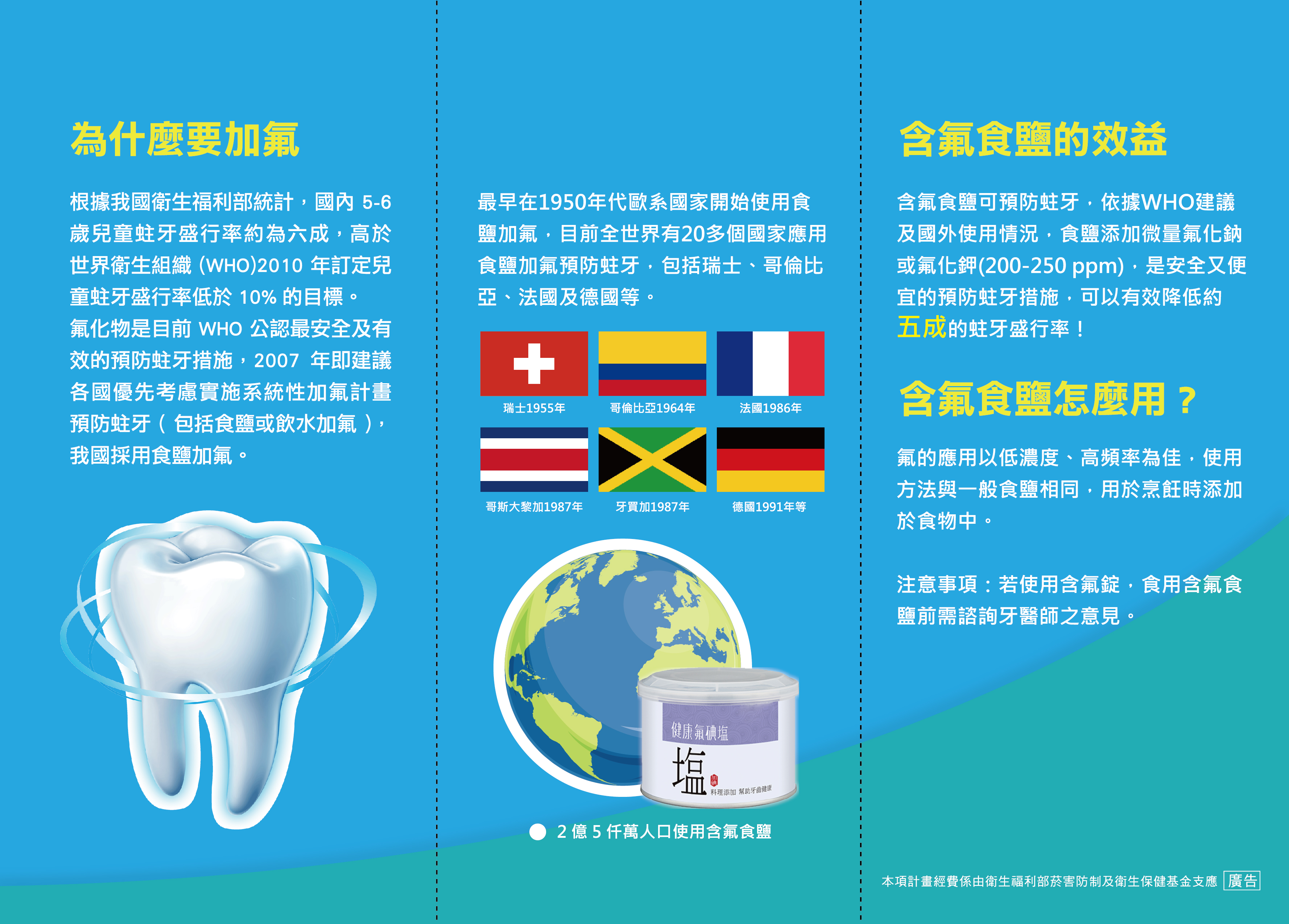 為使牙齒能受到氟的長效保護,衛生福利部積極推廣料理使用加氟食鹽,本次以故事方式拍攝影片,貼近民眾日常生活,鼓勵使用加氟食鹽,增進牙齒健康;分為30秒精華短片及完整長片篇。 宣導短片: 食鹽加氟,牙齒有福(30秒) 食鹽加氟,牙齒有福(完整版)