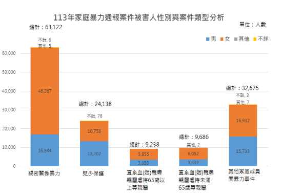 113年家庭暴力通報案件被害人性別與案件類型分析