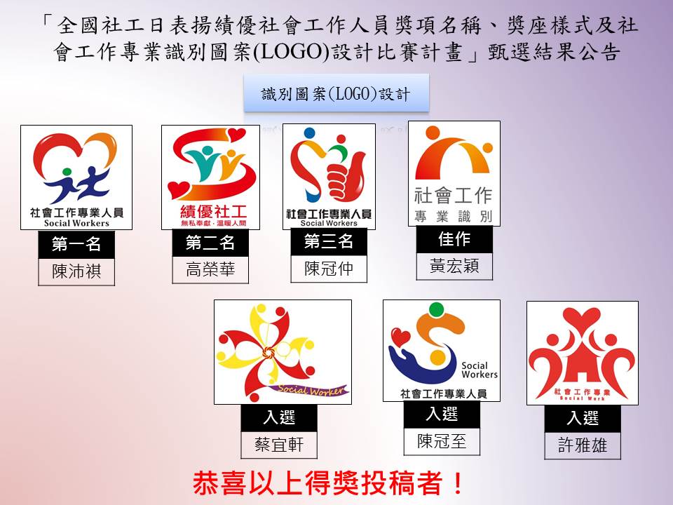 衛生福利部為加強民眾對社會工作人員之認同感與發展期許,並建構社會工作師(員)在全體民眾心中應有的精神象徵,特舉辦全國社工人員獎項及專業識別圖案(LOGO)設計比賽,得獎名單已於10月21日下午公布。表揚績優社會工作人員獎座部分,評審出最佳意象設計獎、最佳視覺效果獎、最佳創意造型獎各1名,分別各得獎金35,000元、25,000元、15,000元及獎狀1紙,佳作1名獲得獎金3,000元及獎狀1紙,另入選獎2名,各頒獎狀1紙;社會工作專業識別圖案(LOGO)部分則評審出前3名,分別各得獎金15,000元、10,000元、8,000元及獎狀1紙,佳作1名獲得獎金3,000元及獎狀1紙,另入選獎3名,各頒獎狀1紙,得獎作品將公開頒獎並擇期展出。 本次活動比賽投稿相當踴躍,總共徵得146件作品,作品來自高中職、大專院校同學及社會人士。參賽者皆發揮創意、巧思,將社會工作專業意涵、社會工作人員關懷助人的特質注入設計元素;經衛生福利部委辦醫務社會工作協會邀集社福及設計領域專家學者、社會工作專業團體及地方政府代表,組成評審小組進行評選,計選出13件優秀得獎作品。(詳情請洽活動網頁) 社會救助及社工司司長李美珍表示,本次徵選活動之目的在於透過公開徵選活動,建立社會工作人員創新、專業、多元、扶弱特色,未來並將廣泛運用於衛生福利部全國社工日(4月2日)表揚、文宣及相關活動,以達到宣傳、識別與社會工作人員精神之展現。 新聞資料詢問:蔡科長適如手機:0922-366156 (單位:社會救助及社工司)