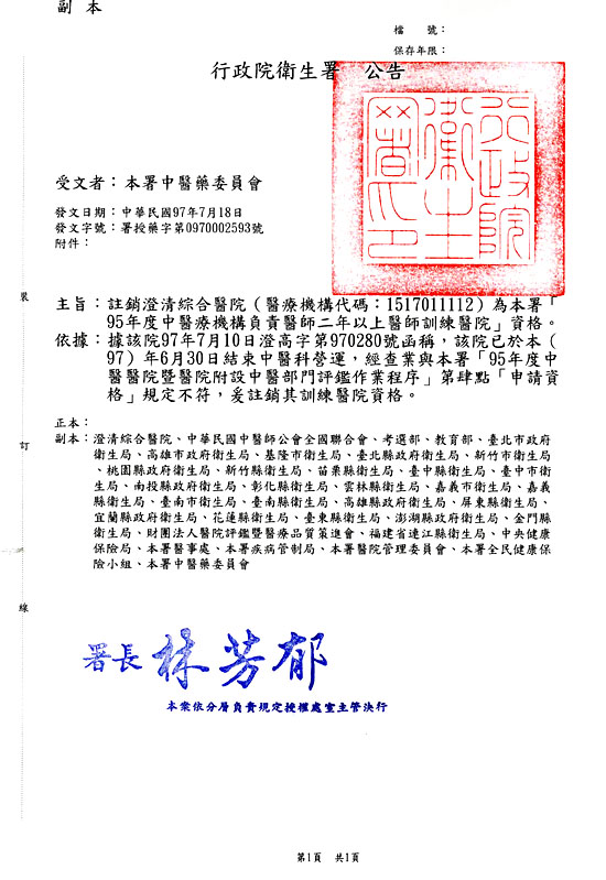 拾、註銷澄清綜合醫院(醫療機構代碼:1517011112)為本署「95年度中醫醫療機構負責醫師二年以上醫師訓練醫院」資格