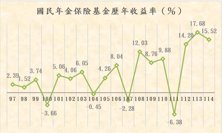 97年為2.39%、98年為1.52%、99年為3.74%、100年為-3.66%、101年為5.06%、102年為4.06%、103年為6.05%、104年為-0.45%、105年為4.26%、106年為8.04%、107年為-2.28%、108年為12.03%、109年為8.76%、110年為9.88%、111年為-6.38%、112年為14.20%、113年為17.68%、114年為15.52%。自97年開辦至114年之加權平均收益率為7.76%