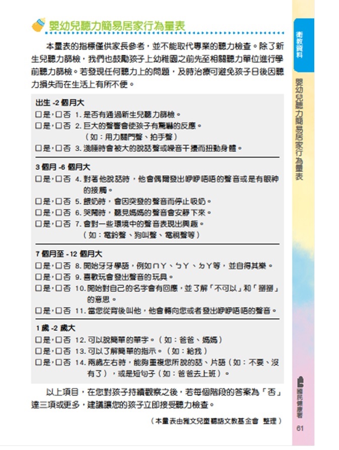 由於新生兒聽力篩檢通過後,並不代表終生沒有問題,部分孩子會因為遲發性聽損或中耳炎、外傷、腦膜炎、感染等因素造成聽力受損,因此仍要請家長多留意孩子聽力狀況,國民健康署提醒家長們,平日可透過「兒童健康手冊」出生至2歲的「聽力簡易居家行為量表」檢視及觀察寶寶對聲音的反應及語言的表現,另外如果發現家中精力旺盛3-4歲小孩,看似健康但講話慢、發音不標準、對父母的呼叫若有若無的反應,家長應盡快帶孩子至醫院耳鼻喉科醫師檢查是否有聽力問題,避免錯失學習語言的先機,只有早期發現幼童的聽力障礙,予以適當的治療和復健,才能降低聽力障礙對孩子的負面影響。