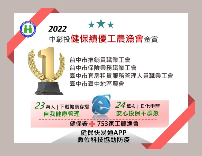 中彰投地區超過105萬鄉親,仰賴753家職業工會、農會及漁會,辦理健保加保及收繳保費。今(111)年新冠疫情期間,中央健康保險署中區業務組為鼓勵工農漁會一起守護會員,藉由「健保第二、三類績優投保單位評選」競賽交流活動,運用健保雲端服務,協助23萬會員下載健康存摺、E化申辦24萬次。另有124家工會累計幫助443人申請保費緩繳達312萬元,並協助660名在國外因疫情影響無法返臺的除籍會員延續健保投保資格,全力拚服務,擴展會員安心幸福感。