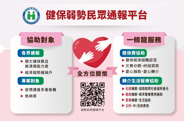 健保署再次呼籲,社會各界若發現經濟困難無力繳納健保費的弱勢朋友,請至健保署官網搜尋「弱勢民眾通報平台」或透過健保Line官方帳號「健保弱勢協助」服務選單通報,以分期繳納、無息紓困基金貸款或愛心轉介公益團體等措施,協助繳納健保欠費。民眾欲進一步了解相關資訊,請至中央健康保險署首頁/健保服務/投保與保費/弱勢協助查詢。