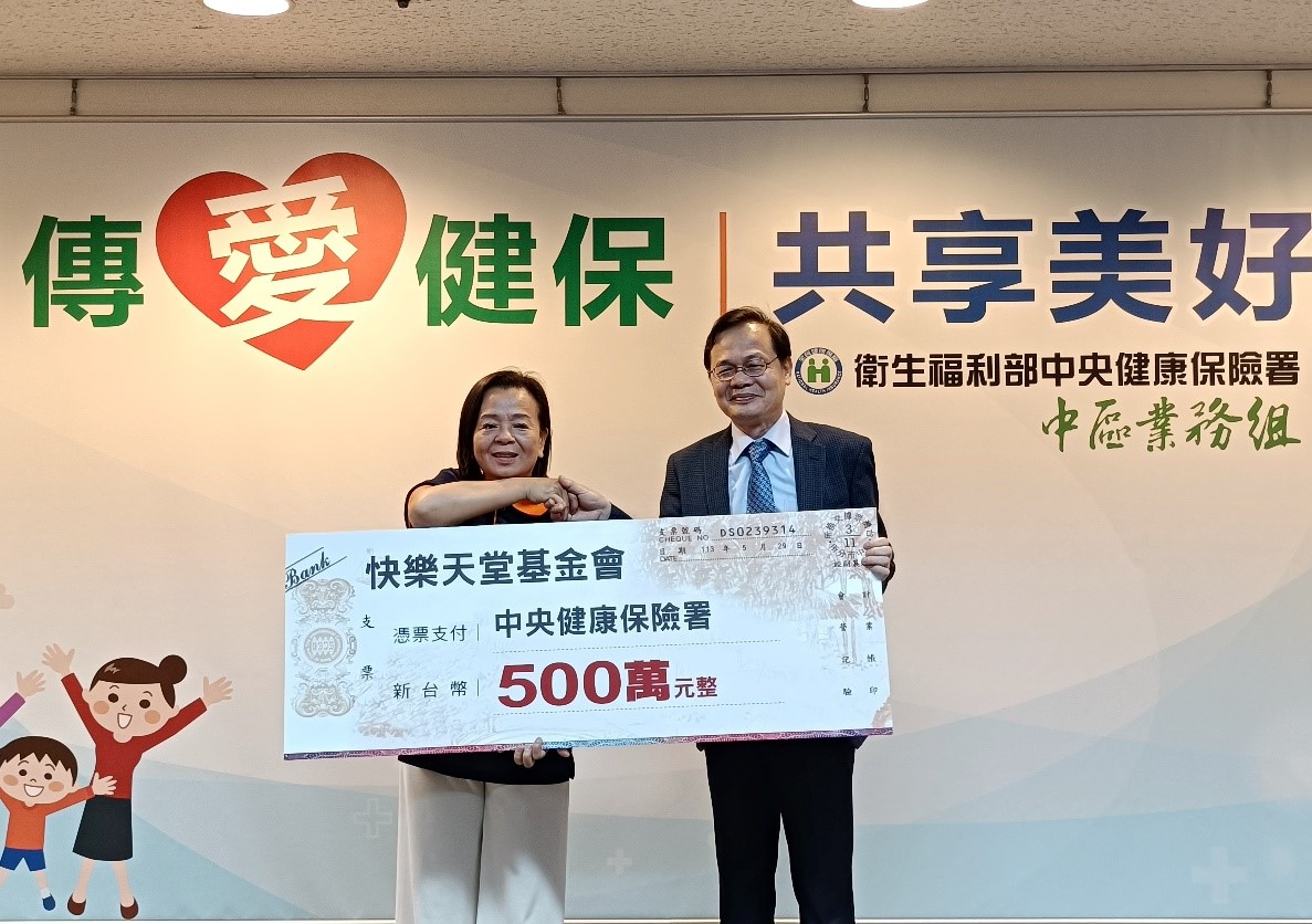 圖3.快樂天堂基金會董事長張雪如(左)5年捐款500萬元予健保署中區業務組,組長丁增輝(右)代表接受。
