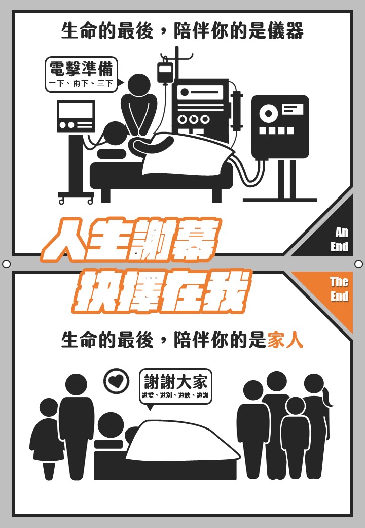 本次得獎的原創圖文作品,金獎為市立聯合醫院中興院區藥劑科翁紹恩主任所繪之「人生謝幕、抉擇在我」,充分表現臨床上民眾及家屬會面對的抉擇,提醒大家可以在意識清楚的時候,及早做好人生最終醫療決策的規劃,為自己做好善終準備與安排;在人生謝幕的時候,免於慌張地進行不必要且無效的治療措施,從容不迫的跟家人道謝、道愛、道歉、道別。