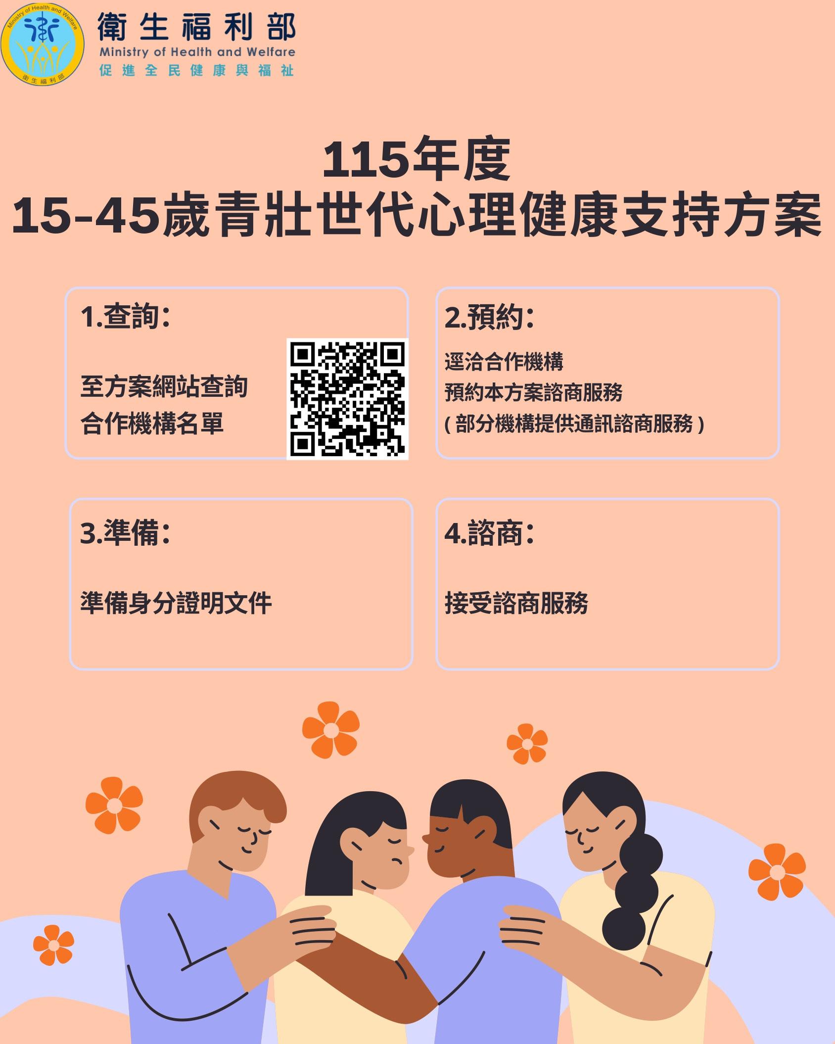 衛福部提醒,113至114年曾使用「青壯世代心理健康支持方案」的民眾,115年可以再次使用,4步驟快速上手預約、接受服務:
