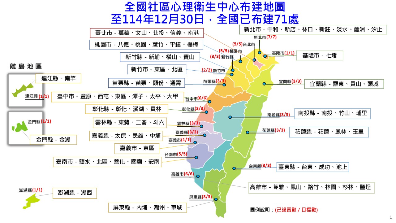 全國社區心理衛生中心布建地圖(22縣市71處)