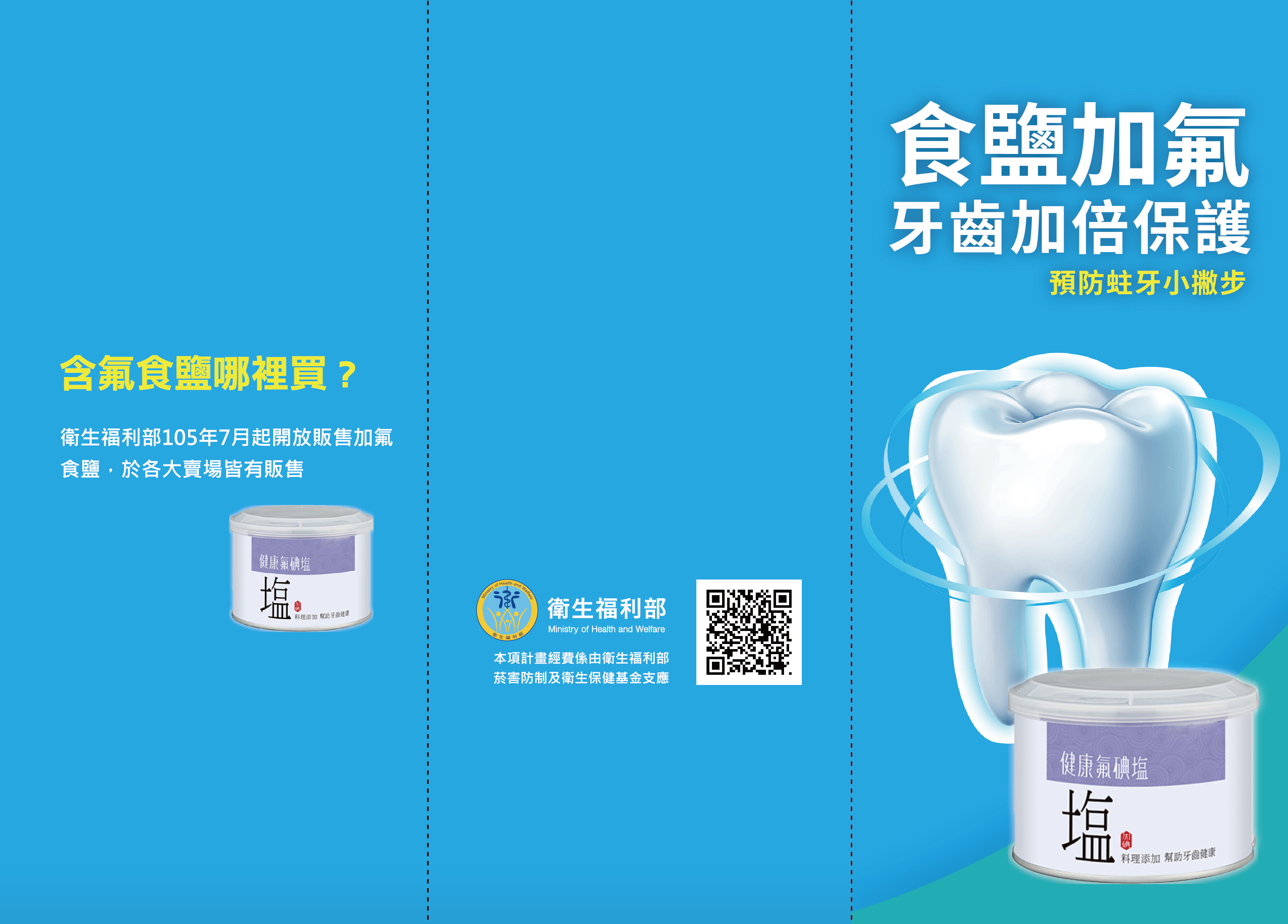 為使牙齒能受到氟的長效保護,衛生福利部積極推廣料理使用加氟食鹽,本次以故事方式拍攝影片,貼近民眾日常生活,鼓勵使用加氟食鹽,增進牙齒健康;分為30秒精華短片及完整長片篇。 宣導短片: 食鹽加氟,牙齒有福(30秒) 食鹽加氟,牙齒有福(完整版)