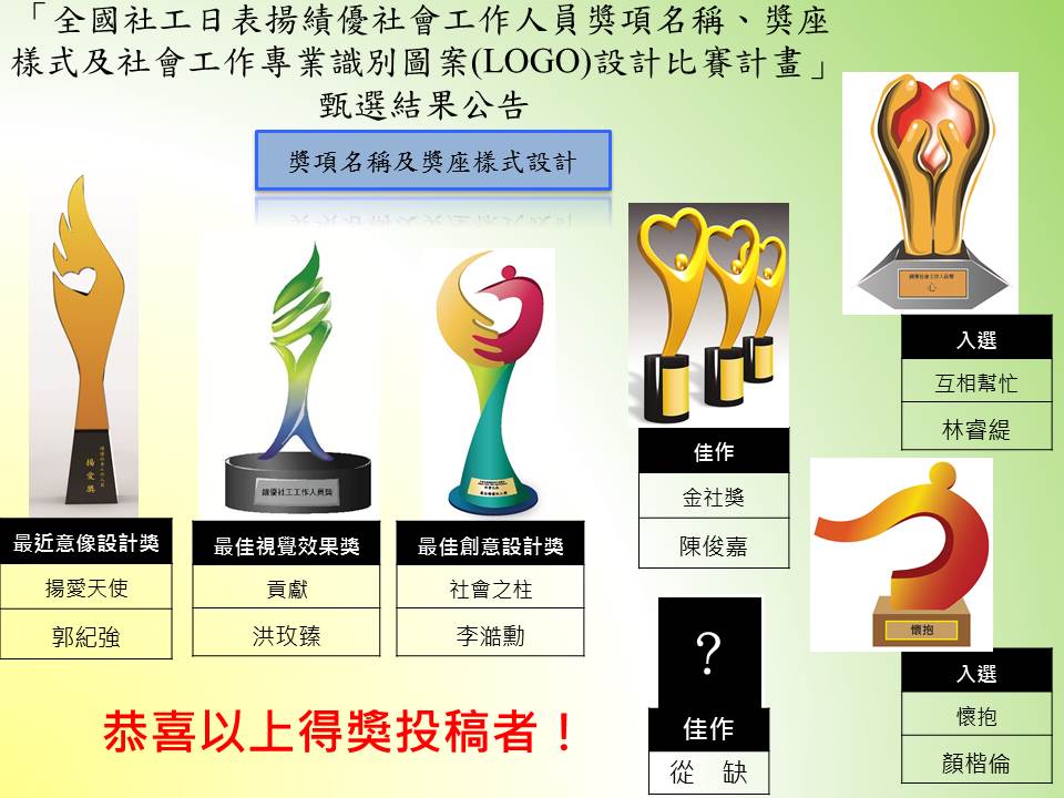 衛生福利部為加強民眾對社會工作人員之認同感與發展期許,並建構社會工作師(員)在全體民眾心中應有的精神象徵,特舉辦全國社工人員獎項及專業識別圖案(LOGO)設計比賽,得獎名單已於10月21日下午公布。表揚績優社會工作人員獎座部分,評審出最佳意象設計獎、最佳視覺效果獎、最佳創意造型獎各1名,分別各得獎金35,000元、25,000元、15,000元及獎狀1紙,佳作1名獲得獎金3,000元及獎狀1紙,另入選獎2名,各頒獎狀1紙;社會工作專業識別圖案(LOGO)部分則評審出前3名,分別各得獎金15,000元、10,000元、8,000元及獎狀1紙,佳作1名獲得獎金3,000元及獎狀1紙,另入選獎3名,各頒獎狀1紙,得獎作品將公開頒獎並擇期展出。 本次活動比賽投稿相當踴躍,總共徵得146件作品,作品來自高中職、大專院校同學及社會人士。參賽者皆發揮創意、巧思,將社會工作專業意涵、社會工作人員關懷助人的特質注入設計元素;經衛生福利部委辦醫務社會工作協會邀集社福及設計領域專家學者、社會工作專業團體及地方政府代表,組成評審小組進行評選,計選出13件優秀得獎作品。(詳情請洽活動網頁) 社會救助及社工司司長李美珍表示,本次徵選活動之目的在於透過公開徵選活動,建立社會工作人員創新、專業、多元、扶弱特色,未來並將廣泛運用於衛生福利部全國社工日(4月2日)表揚、文宣及相關活動,以達到宣傳、識別與社會工作人員精神之展現。 新聞資料詢問:蔡科長適如手機:0922-366156 (單位:社會救助及社工司)