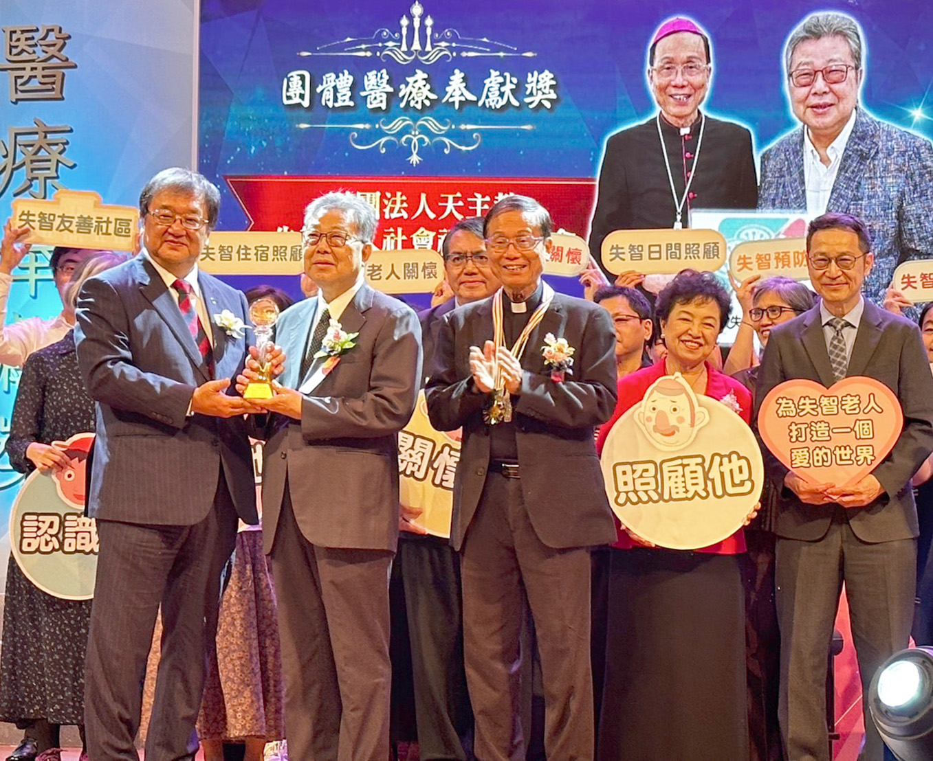 邱部長親頒兩個獎項,一是團體醫療貢獻獎得主「安寧照顧基金會」,二是團體醫療奉獻獎得主「天主教失智老人基金會」。
