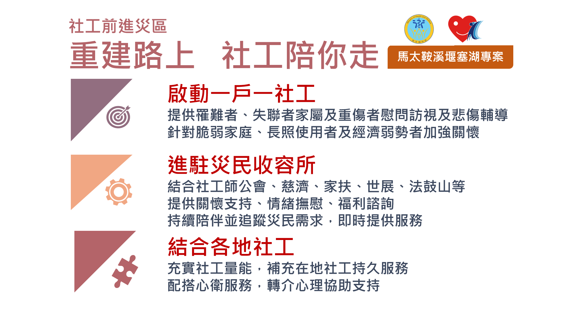 花蓮縣馬太鞍溪堰塞湖災害重創家園,衛福部114年9月24日即協調花蓮縣政府啟動一戶一社工服務,隨著災害搶救時間延長,災民的脆弱性伴隨出現,亟需充實社工量能,補充在地社工持久服務,各地公、私部門社會工作人員積極關注並期待參與協助,衛福部結合社工師公會全聯會號召社工前進災區,獲熱烈響應。